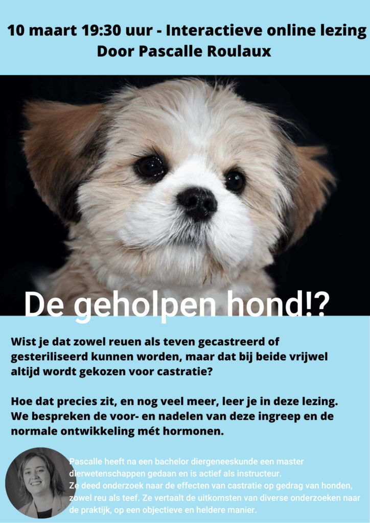 Je ontvangt na inschrijving een week van tevoren een Teams uitnodiging. Meer informatie over de lezing vind je op Pascalle’s pagina dog-knows.nl/geholpen-hond
